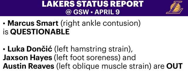 北京时间4月9日,洛杉矶湖人更新了球队的伤病报告,勒布朗-詹姆斯能够出战明天他们在客场与金州勇士的比赛。